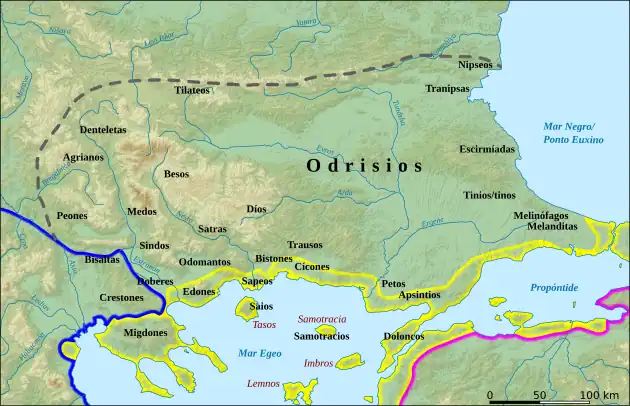 Su capital era Uscudama (llamada así por los tracios) u Ódrisas (llamada así por los griegos), la que más tarde se llamaría Adrianópolis y en la actualidad es Edirne, en la parte europea de Turquía.