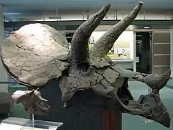 Triceratops (del griego τρι tri, 'tres', κέρας kéras, 'cuerno' y -ωψ -ops, 'cara'[1]) es un género con dos especies conocidas de dinosaurios ceratopsianos ceratópsidos, que vivieron a finales del período Cretácico, hace aproximadamente entre 68 y 66 millones de años, durante el Maastrichtiense, en lo que hoy es Norteamérica. Es uno de los últimos géneros en aparecer antes del gran evento de extinción masiva del Cretácico-Terciario.[2] Poseía una gran gola ósea que le cubría dorsal y lateral del cuello y tres cuernos, un cuerpo grande sobre cuatro robustas patas, y varias similitudes con respecto al moderno rinoceronte y los bovinos. Triceratops es uno de los más reconocidos de todos los dinosaurios. También fue uno de los más grandes, de hasta 8 a 9 metros de largo y de 5 a 9 toneladas métricas de masa corporal. Aunque compartiera el territorio con el temible Tyrannosaurus y fuera cazado por él,[3] no está claro si los dos lucharon de la manera representada a menudo en exhibiciones de museo o en imágenes populares.