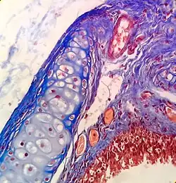 La tinción tricrómica de Masson, al igual que otras tinciones tricrómicas, es una técnica de coloración especial que permite visualizar claramente las fibras de colágeno tipo I que forman fibras gruesas o haces, diseñados para dar resistencia; también evidencia, aunque en menor intensidad, las fibras reticulares. Se emplean tres colorantes para diferenciar el núcleo celular, el citoplasma y las fibras de colágeno.