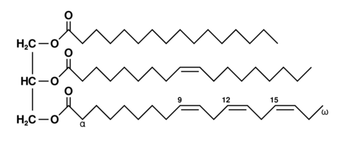 Los tres ácidos grasos (, , ) son generalmente diferentes, pero se conocen muchos tipos de triglicéridos. Las longitudes de cadena de los ácidos grasos en los triglicéridos naturales varían, pero la mayoría contiene 16, 18 o 20 átomos de carbono. Los ácidos grasos naturales que se encuentran en las plantas y los animales están compuestos típicamente de solo un número par de átomos de carbono, lo que refleja la vía para su biosíntesis a partir del acetil CoA de los bloques de construcción de dos carbonos. Las bacterias, sin embargo, poseen la capacidad de sintetizar ácidos grasos de cadenas impares y ramificadas. Como resultado, la grasa animal de rumiantes contiene ácidos grasos de números impares, como 15, debido a la acción de las bacterias en el rumen. Muchos ácidos grasos son insaturados, algunos son poliinsaturados (por ejemplo, los derivados del ácido linoleico).[5]