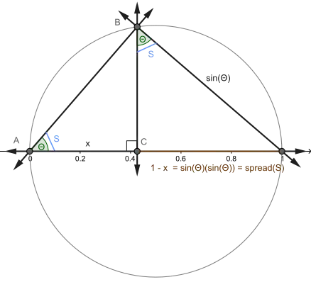 La extensión de un ángulo es el cuadrado de su seno. Dado el triángulo ABC con una extensión de 1 entre los lados AB y AC,