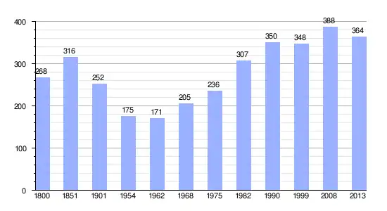Los datos demográficos contemplados en este gráfico de la comuna de Triquerville[4] se han cogido de 1800 a 1999 de la página francesa EHESS/Cassini, y los demás datos de la página del INSEE.[5]