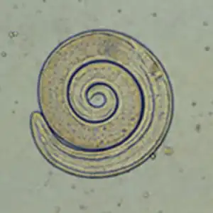 Larva de Trichinella spiralis con su típica forma de caracol. | ||