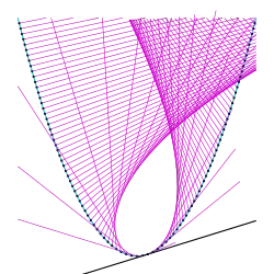 | Cáustica de una parábola. Solo se muestran los rayos reflejados. La dirección de los rayos incidentes (no mostrados) viene dada por la de la tangente común a la parábola y a la cáustica, en negro. Los rayos reflejados a la izquierda de la parábola provienen de una fuente en el infinito hacia la derecha, los reflejados a la derecha de la parábola provienen de una fuente en el infinito hacia la izquierda |