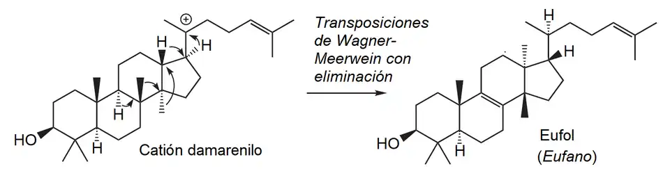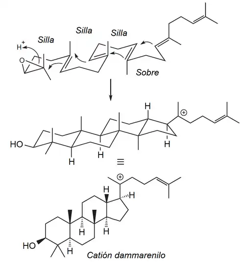 - Vía dammaranoide: Los derivados del dammarano se forman a partir del epóxido de escualeno, el cual promueve la secuencia concertada de ciclizaciones para dar el catión dammarenilo: