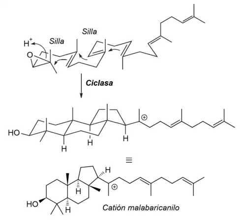 - Vía malabaricano: Sólo se forman tres ciclos y el resto de la cadena queda libre. La enzima más estudiada ha sido la arabidiol sintasa.[4]