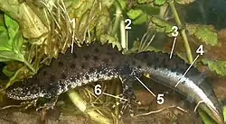 Ejemplar macho de unos 11 cm de largo, poco después del final del período de reproducción (morfológicamente entre la fase acuática y terrestre), Alemania, 2009. -