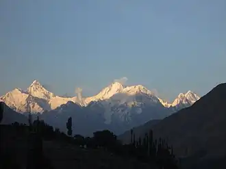 Trivor (extremo derecho), visto desde el valle de Hunza. | ||