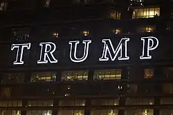 Según Trump, recibió la aprobación para colocar un letrero de 334,5 m² por parte de la administración del Alcalde de Chicago, Richard M. Daley en 2009, pero tuvo que renegociar con la administración del Alcalde Rahm Emanuel. En octubre de 2013, Trump recibió la aprobación para instalar cinco letras con iluminación LED blanca 6,10 m de altura de acero inoxidable formando la palabra TRUMP, en el piso 16 del edificio. Hizo público sus planes para instalar el letrero en febrero de 2014.[34] Según una portavoz del departamento de planificación de la ciudad, el protocolo estándar para este tipo de letrero requiere la aprobación del concejal local (Brendan Reilly, 42.º barrio) y la totalidad del Consejo de la Ciudad de Chicago. Las cinco letras abarcan un ancho de aproximadamente 42,98 m, haciendo que la versión final aprobada aproximadamente cubra unos 260,1 m²—268,58 m² de acuerdo a algunas fuentes—, en lugar de la propuesta original.[35] El letrero se encuentra a unos 61 m sobre el nivel del suelo.[36]