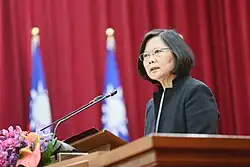 Tsai Ing-wen (en chino tradicional, 蔡英文; pinyin, Cài Yīngwén; Wade-Giles, Ts'ai Ing-wen; Taipéi, 31 de agosto de 1956) es una política y académica taiwanesa que se desempeñó como presidenta de la República de China (Taiwán) desde 2016 hasta 2024.[1] Miembro del Partido Progresista Democrático (PPD), Tsai es la primera mujer en desempeñarse como presidenta de Taiwán. Se ha desempeñado como presidenta del PPD desde 2020 a 2023 y anteriormente de 2008 a 2012 y de 2014 a 2018.[2]