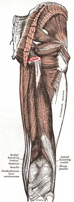 • la mitad interna da inserción al ligamento sacrociático mayor o sacrotuberoso.