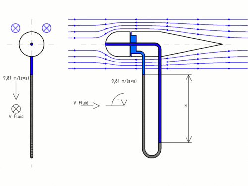En el croquis se aprecia esquemáticamente, un tubo de Prandtl inmerso en un fluido de densidad , conectado a un manómetro diferencial cuyo líquido manométrico tiene densidad .
