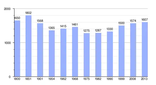 Los datos demográficos contemplados en este gráfico de la comuna de Tuffé[4] se han cogido de 1800 a 1999 de la página francesa EHESS/Cassini, y los demás datos de la página del INSEE.[5]