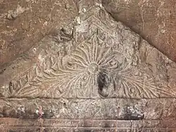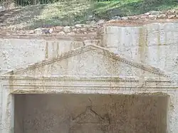 La fachada del recinto subterráneo está decorada con un frontón al estilo griego antiguo, detalladamente elaborado (de los mejores conservados del Jerusalén de la época),[12] que corona el dintel de un amplio portal cuadrado que rodea la puerta de entrada. Su decoración vegetal, en forma de grabados de granadas, etrogim (variedad de limón con fines litúrgicos), higos y hojas de acanto, está claramente influenciada por la arquitectura helenística (prueba de un proceso de helenización artística de la comunidad judía el siglo I).[13] En el interior de la entrada, por encima de la puerta, hay otro frontón más pequeño, decorado también con tallas y hojas de acanto. La decoración vegetal era muy común entre los judíos del período del Segundo Templo, quienes compensaban la prohibición bíblica anicónica con grabados de plantas litúrgicas y de la Tierra Santa. La entrada estaba originalmente cerrada por una puerta de piedra.[4]