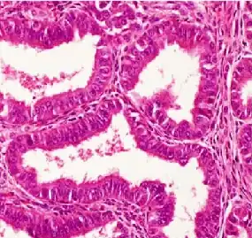 ![]() Histopatología de un adenocarcinoma endometrioide bien diferenciado en el ovario | ||