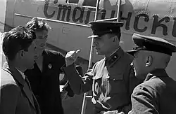 • El 18 de junio de 1937, la aeronave ANT-25 despegó del aeródromo de Shchelkovsky y realizó un vuelo sin escalas en la ruta Moscú-Polo Norte-Estados Unidos, con una escala en el aeródromo de Pearson en Vancouver, Washington con una tripulación formada porː Valeri Chkálov (comandante), Gueorgui Baidukov (copiloto), Aleksandr Belyakov (navegante).[3]