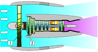 En un turboventilador con engranajes, un reductor planetario entre el ventilador y el eje LP permite que este último funcione a una velocidad de rotación más alta, lo que permite utilizar menos etapas tanto en la turbina LP como en el compresor LP, aumentando la eficiencia y reduciendo el peso. Sin embargo, parte de la energía se perderá en forma de calor en el mecanismo de engranaje y el peso ahorrado en las etapas de la turbina y el compresor se compensa en parte con el de la caja de cambios. También hay implicaciones de costes de fabricación y de fiabilidad.