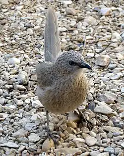 Mide entre 26 y 29 cm de longitud, tiene 31 a 33,5 cm de envergadura y pesa entre 64 y 83 gramos. Tiene el pico curvo bastante largo, cola larga, alas redondeada y piernas patas fuertes. El plumaje es de color gris marrón por encima y pálido por debajo. Tiene rayas oscuras en el dorso y el cuello es de color blanquecino. Dispone de una variedad de llamadas incluyendo silbidos, trinos y parloteos.