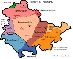 - Turingio oriental, hablado alrededor de Eisenberg y Altenburg así como en las áreas vecinas de Naumburg, Weissenfels y Zeitz, en Sajonia-Anhalt
