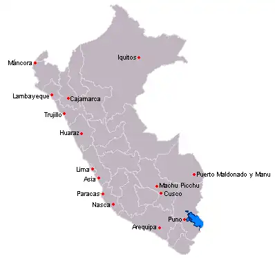 Puno es un departamento del Perú situado en el sureste del país. Ocupa 67 mil km² de territorio conformado por la mitad occidental de la Meseta del Collao, al oeste del lago Titicaca, y las yungas amazónicas al norte. Limita al este con territorio boliviano, al suroeste con los departamentos de Tacna, Moquegua y Arequipa, al oeste con el del Cuzco y al norte con Madre de Dios.