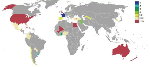Para el sorteo se dividieron los equipos clasificados en cuatro bombos, uno destinado para los campeones de cada continente y los tres restantes juntando a las selecciones por confederación.[4] En el momento del sorteo aún no habían finalizado los torneos clasificatorios de África y Oceanía. Dado que las selecciones africanas contaban con más de un equipo, el 30 de marzo se sortearon las colocaciones de tres de los equipos, mientras que ya estuviera definido el grupo a donde iría el campeón del torneo.[5]