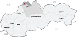 Se encuentra ubicado al noroeste de la región, cerca del curso alto del río Váh (cuenca hidrográfica del Danubio) y de la frontera con la República Checa y Polonia.[2]