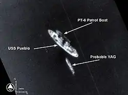 El USS Pueblo (AGER-2) es un buque estadounidense ELINT y SIGINT[1] de la clase Banner para investigaciones técnicas, que fue capturado por las fuerzas de Corea del Norte el 23 de enero de 1968, en el hecho conocido como Incidente del USS Pueblo o también como Crisis del USS Pueblo y Asunto del USS Pueblo. El registro SIGAD desclasificado del Grupo de Seguridad Naval (NSG) a bordo del USS Pueblo durante la patrulla cuando ocurrió el incidente, para la Unidad de Apoyo Directo (DSU) de la Agencia de Seguridad Nacional (NSA), era USN-467Y.[2][3] La captura ocurrió una semana después de que el presidente de Estados Unidos, Lyndon B. Johnson, diese su discurso del Estado de la Unión en el Congreso, y una semana antes del inicio de la ofensiva del Tet; siendo junto al subsiguiente encarcelamiento de la tripulación por las autoridades norcoreanas durante once meses un importante incidente de la Guerra Fría.[3]