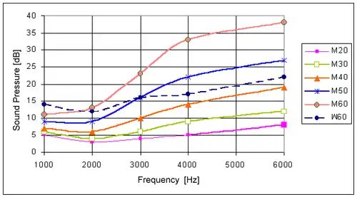Por debajo de 2000 Hz y según se va bajando en frecuencia, el oído se vuelve menos sensible. Los umbrales de audición para frecuencias menores de 2 kHz son: