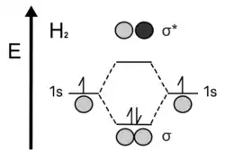 En el ejemplo clásico del , los dos átomos de separados tienen orbitales atómicos idénticos. Al crear la molécula de dihidrógeno, los orbitales de valencia individuales, 1s, ya sea: se fusionan en fase para obtener orbitales de enlace, donde la densidad de electrones se encuentra entre los núcleos de los átomos; o fusionarse fuera de fase para obtener orbitales antienlazantes, donde la densidad de electrones está en todas partes alrededor del átomo excepto en el espacio entre los núcleos de los dos átomos.[3] Los orbitales de enlace conducen a una especie más estable que cuando los dos hidrógenos son monoatómicos. Los orbitales anti-enlace son menos estables porque, con muy poca o ninguna densidad de electrones en el medio, los dos núcleos (que tienen la misma carga) se repelen entre sí. Por lo tanto, se necesitaría más energía para mantener los dos átomos juntos a través del orbital antienlazante. Cada electrón de valencia 1s del hidrógeno se unen para establecer una unión de estabilización orbital. Por lo tanto, el hidrógeno prefiere existir como molécula diatómica y no monoatómica.[4]