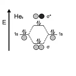 Al mirar el helio, el átomo contiene dos electrones en cada capa de valencia 1s. Cuando los dos orbitales atómicos se unen, primero llenan el orbital de enlace con dos electrones, pero a diferencia del hidrógeno, le quedan dos electrones, que luego deben ir al orbital antienlazante. La inestabilidad del orbital antienlazante anula el efecto estabilizador proporcionado por el orbital enlazante; por lo tanto, el orden de enlace del dihelio es 0. Esta es la razón por la que el helio preferiría ser monoatómico sobre diatómico.[5]