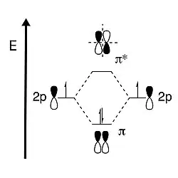 Los enlaces pi son creados por las interacciones "laterales" de los orbitales.[3] Una vez más, en los orbitales moleculares, los electrones pi (π) de enlace se producen cuando la interacción de los dos orbitales atómicos π están en fase. En este caso, la densidad electrónica de los orbitales π debe ser simétrica a lo largo del plano del espejo para crear la interacción de enlace. La asimetría a lo largo del plano del espejo conducirá a un nodo en ese plano y se describe en el orbital antienlazante, π*.