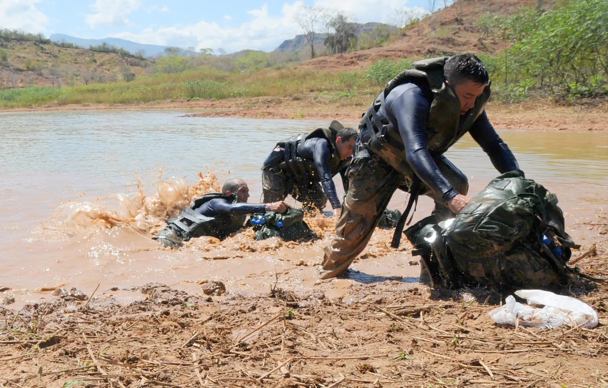 ![]() Miembros del equipo de Operaciones Especiales de Costa Rica, llegan a la costa después de cruzar nadando un gran estanque, en el evento Fuerzas Comando, en Nilo, Colombia, el 28 de julio. | ||