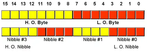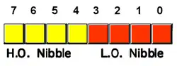 Un byte consta también de 2 nibbles; los bits 0, 1, 2 y 3 forman el llamado nibble de menor orden, y los bits 4, 5, 6 y 7 forman el nibble de mayor orden. Como un byte está formado por exactamente dos nibbles, es posible representar cualquier valor con dos dígitos hexadecimales.[5]