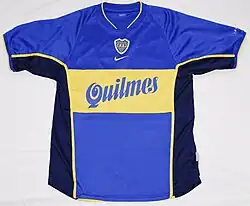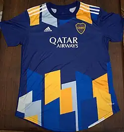 En 1907 se usaron por primera vez los colores azul y amarillo (azul y oro), pero con una línea amarilla en diagonal, inversamente del diseño de River Plate.[5] En 1912, se incluyó por primera vez la franja horizontal amarilla, la cual perduró en el tiempo, ya que permaneció hasta la actualidad. En 1981, con la llegada de la marca alemana Adidas como proveedor, se agregaron por encima de la franja cuatro estrellas amarillas, en cada una de ellas habiendo letras que conformaban la sigla del club, "CABJ", aunque estas se quitaron al estrenarse un nuevo modelo en 1985. En 1983 llega el primer patrocinador: Vinos Maravilla.[6] En 1996, se agregaron finas líneas por arriba y abajo de la franja amarilla, algo rechazado por una de sus máximas estrellas, Diego Maradona, quien comparó la camiseta con la del equipo de Universidad de Míchigan.[7] En 1998, la franja se vuelve 33 cm más ancha, quitándose las líneas blancas. En el año 2000, la franja vuelve a sus medidas originales, y el azul se vuelve más claro. Ya en el nuevo milenio, se agregan a los costados y hasta las mangas, una franja vertical azul oscuro. Desde 2011 y hasta 2012, la franja amarilla recorría toda la camiseta, pero se cortaba a los costados, además, la mitad inferior de las mangas era amarilla. A partir de julio de 2016, se usó una franja más fina y en una ubicación más alta de lo común, sobre un azul oscuro. En 2023 se utilizaron tonalidades de azul tanto claras como oscuras emulando las chapas de Caminito.