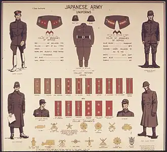 - ↑ https://www.ibiblio.org/hyperwar/Japan/IJA/HB/img/hb-11-1.jpg (U.S.) War Department TM-E30-480. Handbook on Japanese Military Forces, 15 September 1944, Chapter XI, Uniforms, Personal Equipment, and Insignia