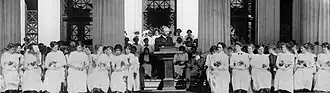 John F. Kennedy, el entonces presidente de los Estados Unidos dio el discurso de graduación en la Universidad Estatal de San Diego el 6 de junio de 1963.[27][28][29][30] Kennedy recibió un doctorado honoris causa en Derecho en la ceremonia, haciendo que SDSU fuera el primera Colegio del Estado de California en conceder un doctorado honoris causa. En 1964, este evento se registró como Señal Histórica de California #798.