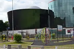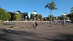 Estacionamiento de la Plaza Cívica siendo utilizado por la población en una tarde de domingo. Al fondo, el Centro de Ciencias.