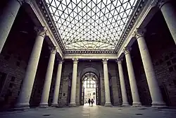 Situado tras la torre-puerta, es un patio rectangular a la manera de atrium corintio, con diez columnas de granito de diez metros y medio de altura cada una. Su objetivo, en palabras de Moya era «proporcionar la debida impresión de dignidad en el acceso a la gran plaza y preparar su escalada». Tras pasar el atrio, un acceso al patio se convierte en punto de fuga que muestra la torre y la iglesia. En la reforma de 2007 se añade un techo acristalado.[37]