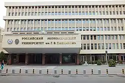 La Universidad Rusa de Economía Plejánov ( en ruso: Российский экономический университет имени Г. В. Плеханова ) es una universidad pública de investigación en Moscú (Rusia). Fue fundada en 1907 por el empresario Alexei Vishnyakov como la primera universidad especializada en finanzas del Imperio ruso. [1][2] Nació como Instituto Comercial de Moscú (1907-1919) y luego se llamó Instituto Karl Marx de Economía Nacional de Moscú (1919-1924); Instituto Plejánov de Economía Nacional de Moscú (1924-1991); Academia Rusa de Economía Plejánov (1992-2010); Universidad Rusa de Economía Plejánov (desde 2010 hasta la actualidad). La Universidad Plejánov absorbió a la Universidad Estatal Rusa de Comercio y Economía y a la Universidad Estatal de Economía, Estadística e Informática de Moscú .