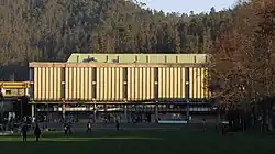 En 1931, la Universidad de Concepción pidió al urbanista austriaco Karl Brunner una planificación para el desarrollo del campus central de la Universidad, idea iniciada por Enrique Molina Garmendia. El proyecto de Brunner contempló trabajos que deberían extenderse hasta al menos 1956. en 1944 se inauguraron la Casa del Deporte y el Campanil,[18]​ siendo construida por el arquitecto Enrique San Martín Sepúlveda, tal y como aparece reseñado en la placa de la entrada.