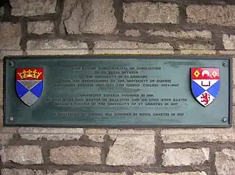 En 1881, el University College Dundee (Órgano colegiado universitario de Dundee) se estableció con el fin de "promover la educación de las personas y desarrollar los estudios de las ciencias, de la literatura y las bellas artes".".[3][4] Este órgano colegiado universitario no tenía el derecho a otorgar títulos y durante muchos años, sólo preparaba los estudiantes para los exámenes que tenían que realizar en la Universidad de Londres.