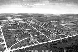 La Ley Buckman no especificó dónde estaría ubicada la nueva Universidad del Estado de Florida. La ciudad de Gainesville, liderada por su alcalde William Reuben Thomas, hizo campaña para ser la sede de la nueva universidad, siendo su principal competidor Lake City. [6] Después de un breve pero intenso período de cabildeo, la Junta de Control seleccionó Gainesville el 6 de julio de 1905 y se asignaron fondos para la construcción de un nuevo campus en el extremo occidental de la ciudad. Sin embargo, debido a que la construcción del campus llevaría varios meses, la nueva escuela se ubicó en el campus del ahora desaparecido Florida Agricultural College en Lake City durante el año académico 1905-1906. El expresidente de la FAC, Andrew Sledd, fue elegido para ser el primer presidente de la Universidad del Estado de Florida.