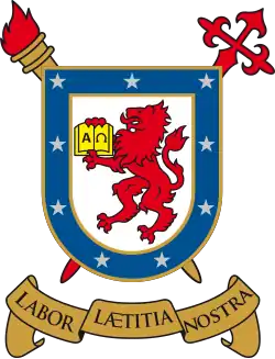 Abajo, de anaranjado, una cinta cargada de letras de sable o negro, en la siniestra "Labor", en el centro "Lætitia", y a la diestra "Nostra".
