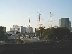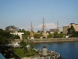 El Campus Etchujima visto desde el Puente Aioi, en el río Sumida. El barco (Meiji Maru) fue usado por la escuela desde 1897 hasta 1945.