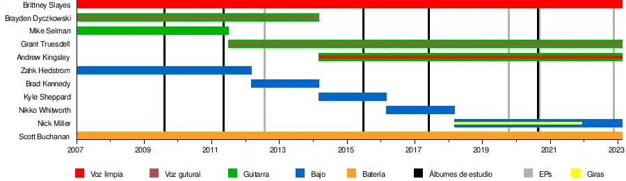 - Brittney Hayes (también conocida como Brittney Slayes) – voz limpia (2007–presente)[25]