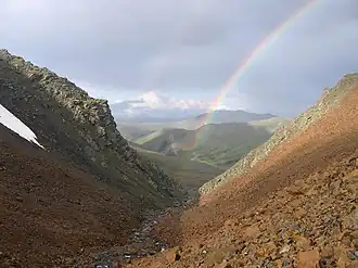 Las montañas muestran rastros de antiguas glaciaciones masivas en valles en forma de U, circos y morrenas. Quedan algunos pequeños glaciares, como el glaciar del Instituto Geográfico y el glaciar Dolgushin.