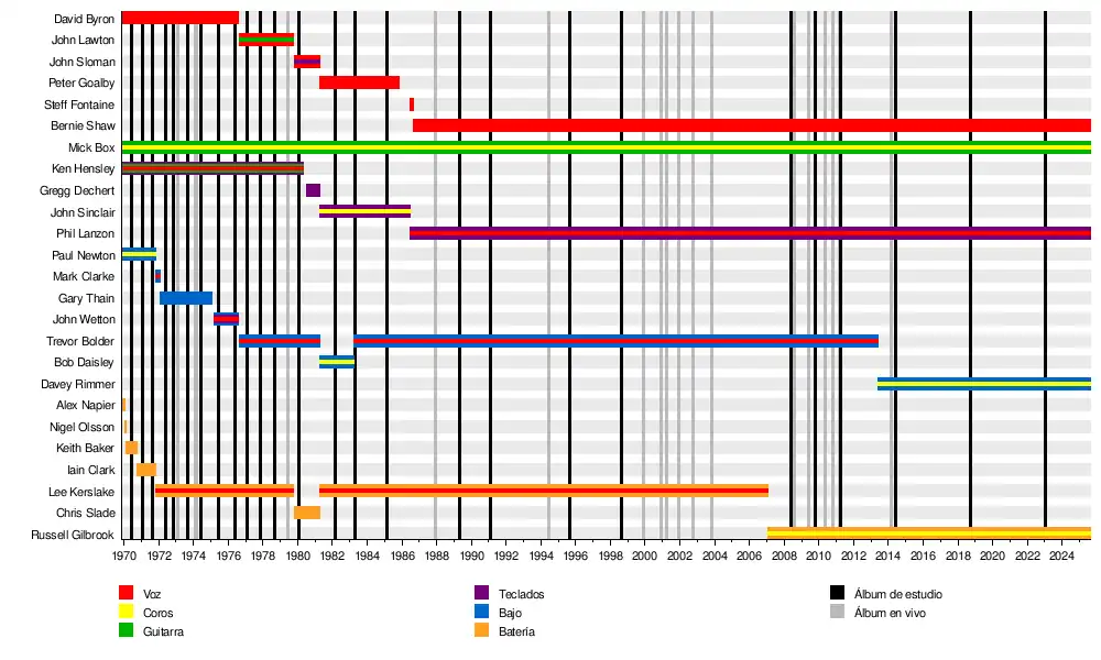 Ken Hensley (fallecido) David Byron (fallecido) Paul Newton Alex Napier Nigel Olsson Keith Baker Iain Clark Lee Kerslake (fallecido) Mark Clarke Gary Thain (fallecido) John Wetton (fallecido) Trevor Bolder (fallecido) John Lawton (fallecido) Chris Slade John Sloman Gregg Dechert John Sinclair Peter Goalby Bob Daisley Steff Fontaine | ||