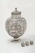 Es un recipiente de cuerpo esférico con cuello cilíndrico y pie circular, tiene un asa lisa en forma de "C" unida a la tapa circular y achatada con un remate de bola. La tapadera presenta unas decoraciones radiales a su cuello con unos óvalos estrechos y verticales y por último, el cuerpo de la urna donde la decoración se realizó con cuatro grandes "C" cinceladas con adornos vegetales a cada lado y un gran escudo central coronado y sostenido por un águila con las alas abiertas, el escudo es el que corresponde al Consejo de Mestas, cuarteado con castillo, león rampante, carnero y toro, una granada en la punta y con la inscripción alrededor de REAL / CABAÑA.[1]