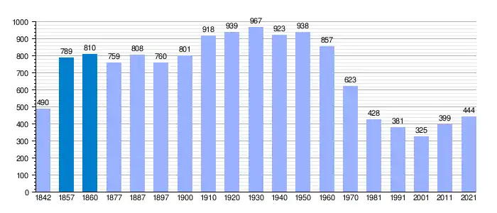 | Gráfica de evolución demográfica de Urrea de Jalón[3] entre 1842 y 2021 |