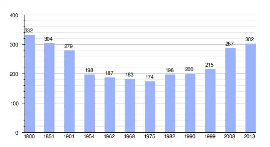 Los datos demográficos contemplados en este gráfico de la comuna de Vérigny[4] se han cogido de 1800 a 1999 de la página francesa EHESS/Cassini, y los demás datos de la página del INSEE.[5]